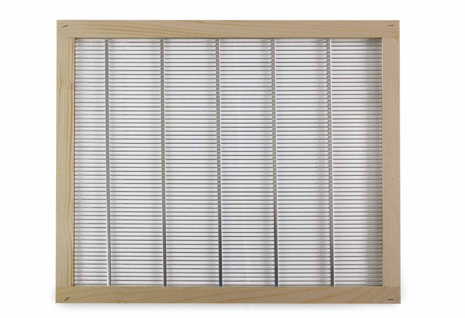 Escludiregina a griglia in acciaio zincato, montata su telaio in legno.
