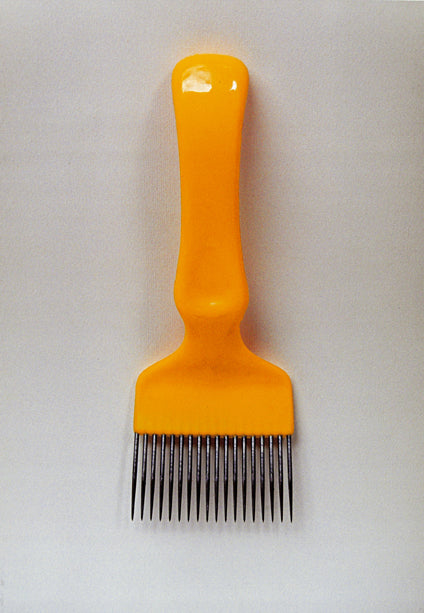 Forchetta per disopercolare con manico in plastica colorato e punte in acciaio.